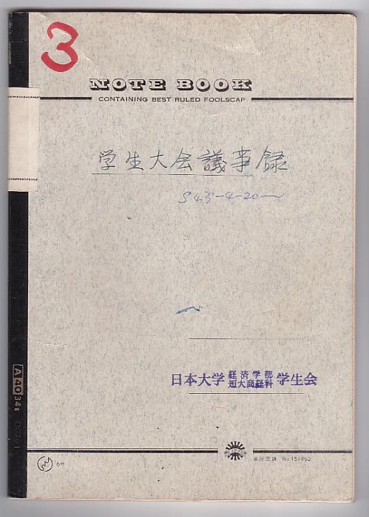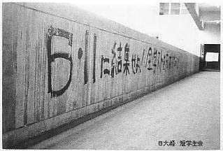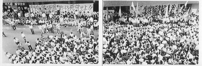 文理にて,午前2:00学生会議(右翼)約70名が学内に殴り込みをかけたが追い散らし,そのうちの一人を捕らえ,城西署へ突き出す。 全学集会 2:00〜。 1968-6-20(木) 経済学部講演会「日大改善案闘争」(昭和33年) 1968-6-21(金)7:00〜8:30まで本部の回答待ち集会を開くも,回答はこず。 経済学部講演会 国分一太郎氏「教育問題」(約500名。) 1968-6-22(土)2:00より,経済学部学生集会・討論。 2:15法学部行動隊60名デモ。 法学部で,映画「圧殺の森」上映(500名) 三島校舎では,2,000名デモを敢行し,24日ストライキ突入を確認。 農獣医学部ストライキ突入。 1968−6−24(月) 三島文理ストライキ突入。本館2回以上占拠、一階事務関係は封鎖せず。 1968-6-25(火)