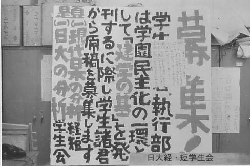 ゲリラ的なアジビラをひたすら隠れて撒き散らす者、校舎壁面にペンキで「自治権奪還」などと落書きする者、エレベーターの扉に抗議文を糊でべったりと貼り付ける者。はがされてもはがされても懲りずに張ってあったビラの数は日ごとに増えていったものだ。