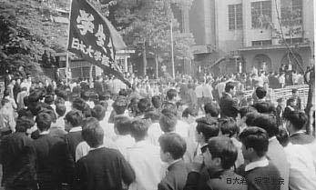 レポの学生が駆けてきて言った。 ★日大建学史上初の街頭学生デモ(200メートルデモ)の出発風景(写真) 最後に何を歌おうか?インターなんて誰も知らなかった…